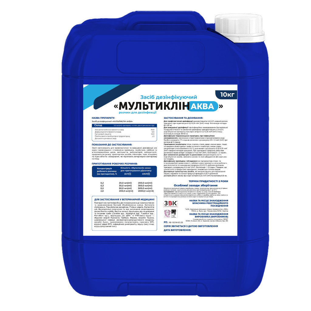Мультиклін Аква – зберігає свою активність на інтенсивному світлі, за умови використання жорсткої води, в присутності органічних матеріалів (залишки корму, тваринні виділення та ін.). Робочі розчини засобу Мультиклін Аква, призначені для дезінфекції різних об’єктів, готують у пластикових, емальованих (без ушкодження емалі) ємностях шляхом додавання до води відповідних кількостей засобу (Таблиця 1).
